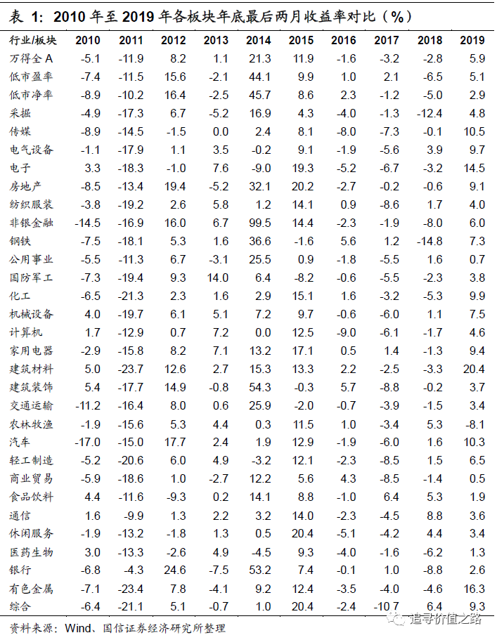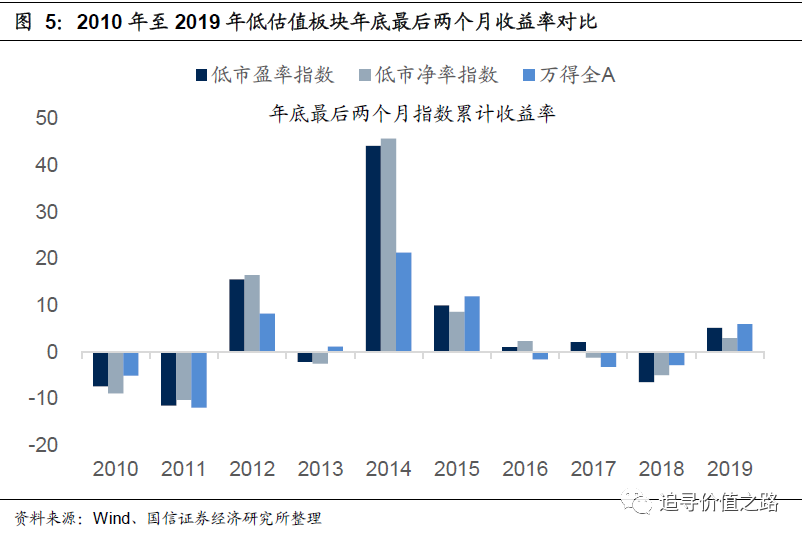 从数据中来看,如果以申万的低市盈率指数和低净盈率指数来度量低估值板块的收益率表现,我们考察年底最后两个月的指数收益率(暨11月到12月的累计收益率)。从2010年到2019年,这十年中,2011年、2012年、2014年、2016年、2017年,这五年低市盈率指数和低净盈率指数是跑赢Wind全A指数的。其实还不止,在2010年和2019年的最后两个月,建筑和建材这两个非权重行业,都出现了大幅上涨的行情。所以在我们的直观感受中,我们会感觉到低估值板块年底逆袭经常出现。