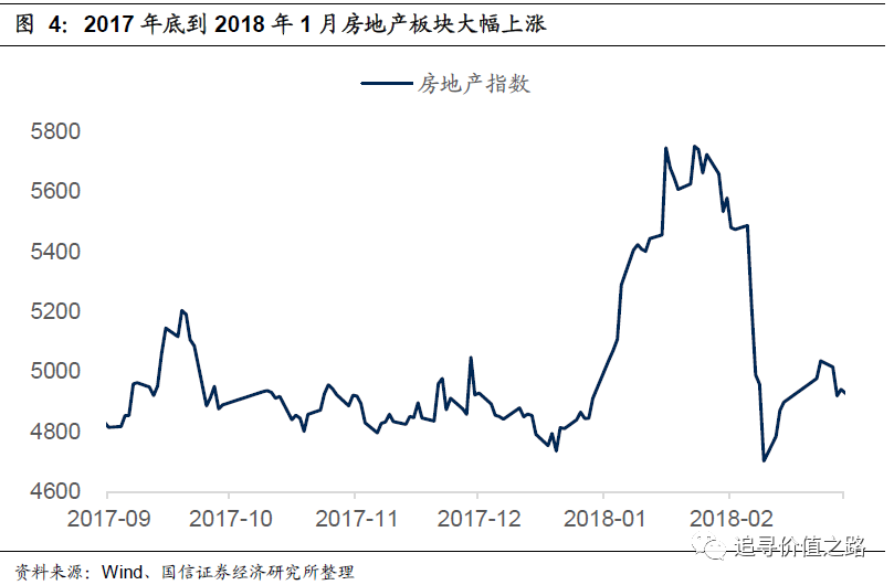 2017年底到2018年初,低估值板块再度出现飙升。这次的领涨板块是房地产和银行,尤其是地产板块,涨幅非常大。这波行情的主要催化剂是当时在国际经济组织连续上调全球经济增速,原油等大宗商品价格上涨的过程中,市场提出了“新周期”和“再通胀”的逻辑,认为供给侧改革以后,中国经济增速可能将进入到一轮新的上升周期,因此金融地产等顺周期板块出现了大幅上涨。