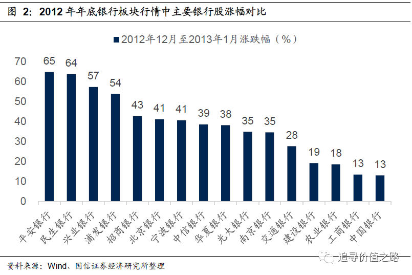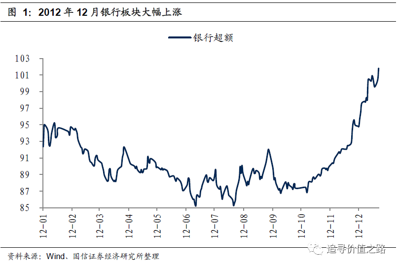 投资者印象最深刻的低估值板块年底逆袭,当属2012年底的那次,那波领涨的是银行板块,银行股在2012年12月出现了大幅拉升,银行指数12月单月涨幅高达23%,跑出了巨大的超额收益。在两个月不到的时间里,平安银行、民生银行、兴业银行、浦发银行涨幅超过了50%。