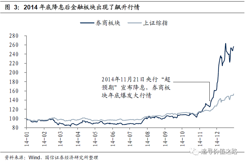 时隔两年,到2014年底,低估值板块出现了一波更大的逆袭走势。这波低估值板块的领涨行业是非银、银行和建筑,在2014年11月和12月的两个月时间里,非银、银行、建筑行业指数的累计涨幅分别为99.5%、53%、54%,房地产和钢铁行业指数也分别有32%和37%的涨幅。这次行情的导火索主要是年底的央行降息,2014年11月21日央行“超预期”宣布降息,直接点燃了行情。