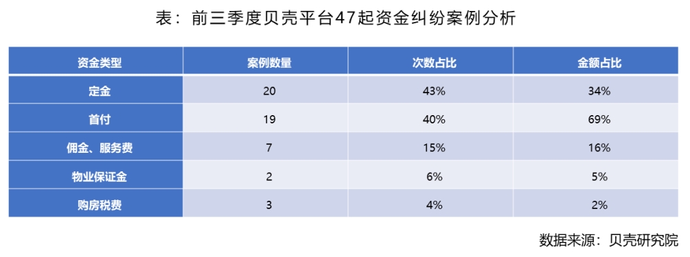 从具体风险案例来看,前三季度,贝壳研究院统计的47起二手房交易资金纠纷投诉案例中,涉及风险总金额1870万元,平均每单风险金额39.8万元,比二季度提高63%。统计案例中,涉及到定金的案件20起,占43%;涉及首付款的案件19起,占40%。风险产生的原因包括业主侵占、产权纠纷、签后查封、以及经纪人或经纪机构挪用等。