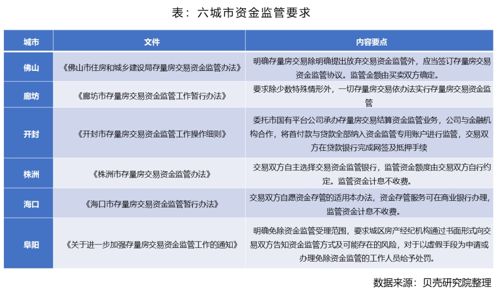 为了进一步保障二手房交易中的资金安全,政府大力推进资金监管业务。今年前三季度,佛山、廊坊、开封、株洲、海口、阜阳6个城市政府出台了二手房交易资金监管相关政策文件,明确资金监管的要求与实施方法。