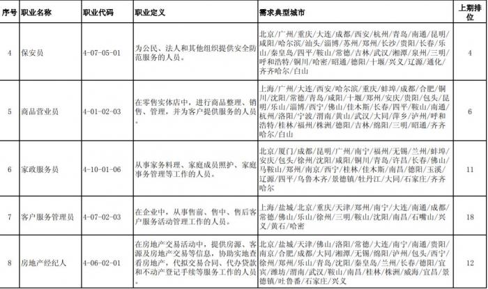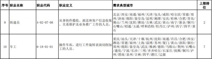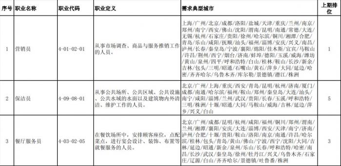 人社部发布2020年第三季度全国招聘大于求职“最缺工”的100个职业排行,与二季度相比,排行“前十”职业,本期“家政服务员”“客户服务管理员”“房地产经纪人”进入前十,“焊工”“市场营销专业人员”“包装工”退出“前十”。另外,随着中小学开学季来临,“中学教育教师”“小学教育教师”也首次进入100个职业排行。