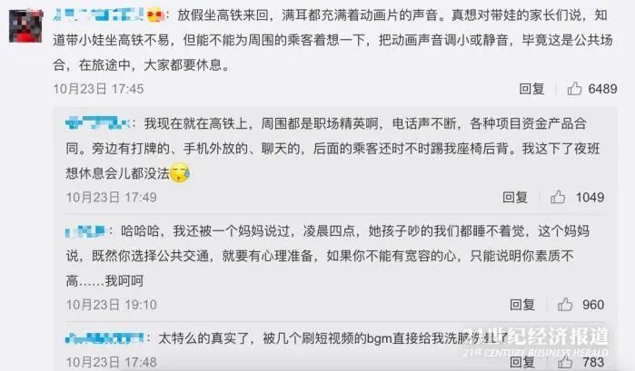 不少网友表示,很多情况下制造“声音”的乘客也有不得已的苦衷。有些家长之所以把孩子带上高铁、飞机,很多情况下是出于对孩子的陪伴;有的旅程时间太久,有时“12小时成人都憋得慌,更别说孩子了”。