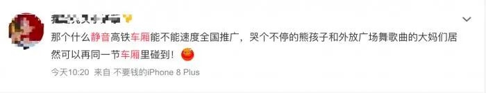 更有甚者,大家围绕“静音车厢”提出了各类推广方案,要在电影院、飞机舱、等一切公共场合推广“静音”。