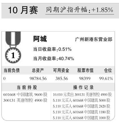 第一名是来自海通证券广州新港东路营业部的阿城,本月收益40.74%,在无为的市场面前能大有作为,值得祝贺;该选手周五卖出英唐智控,相当完美的操作;选手目前持仓中国建筑、英唐智控;持有中国建筑可能是为回避市场风险的避险行为,这类个股基本属于机构专用标的,非普通投资人的猎物;
