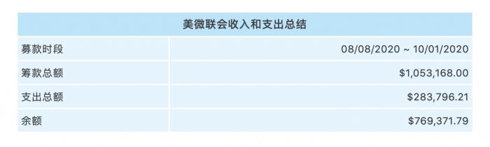 据美微联会披露,自开始筹款至9月6日,共收到1700人次的捐款,其中最大单笔捐款为2000美元, 最小单笔捐款为0.99美元。