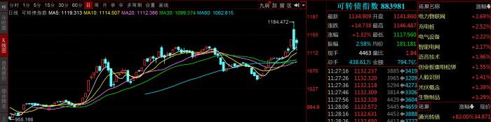 什么也不能阻止可转债的疯狂。 虽然上周监管和公司已经三令五申提示风险,今日可转债新规实施,但是可转债市场的赚钱效应,依然吸引了大量资金涌入。今日早盘又有10只可转债因为涨幅触及红线被临停,其中半数甚至被二次临停。通光转债成为今天的第一主角,盘中一度实现翻倍,最高上涨103.3%,此外宝莱转债的涨幅也一度超过80%,早盘有9只可转债涨幅超20%。可转债市场的成交量也是一日千里,上周四刚刚历史首次突破千亿元,周五成交量继续放大近一倍,全日成交量逼近2000亿,今日早盘则上达到794.4亿元。可转债指数也是芝麻开花节节高,今日上涨1.32%,报1134.91点。