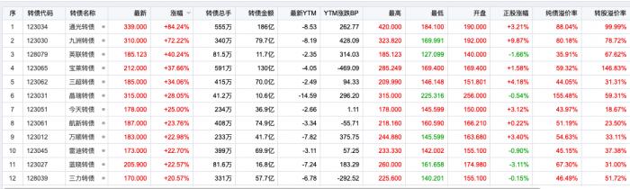 此后部分转债品种继续拉升,通光转债涨幅一度达到近120%。宝来转债最高涨幅打至80%以上。
