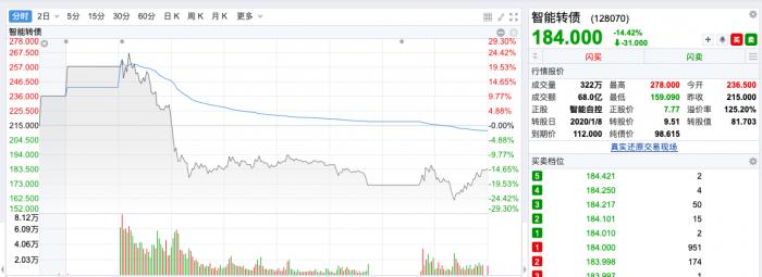 不过,与上周市场不同的是,26日部分可转债品种价格出现较大幅度分化。当日,智能转债就上演“天地板”,从最高278元跌至184元,收跌14.42%,另有太阳转债、银河转债、万里转债以及上周市场热度最高的蓝盾转债均跌幅超过5%。