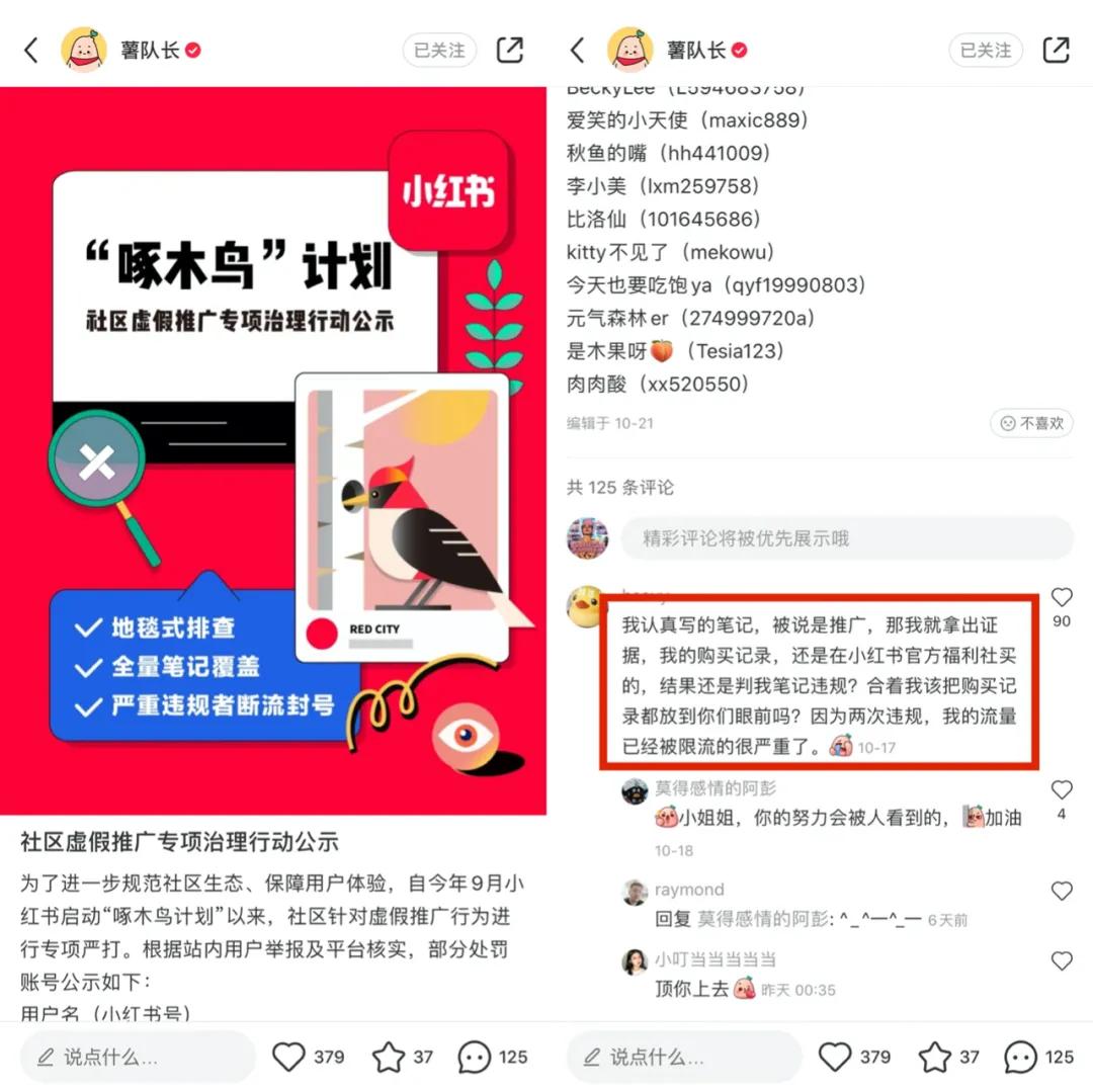 但理想是丰满的,现实是骨感的,基于成本等方面考虑,品牌方跨过平台直接联系MCN或博主推广的现象始终存在。于是,小红书于9月下旬放出了杀手锏——啄木鸟计划。该计划宣称将「针对虚假推广行为进行专项严打」,但小红书官方并未就「啄木鸟计划」作出具体说明。仅强调将用「多维度算法模型+人审」的双重审核对社区内所有涉嫌虚假推广的笔记断流和删除处理。