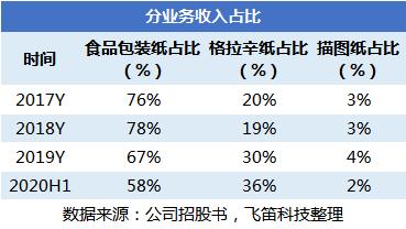 分业务看,报告期内,公司主要以销售食品包装纸、格拉辛纸,以及描图纸为主。其中,食品包装纸的收入占比最大,均值为70%左右,其次为格拉辛纸,占比为26%左右,描图纸占比3%左右。