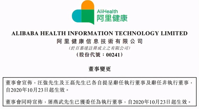 10月23日,阿里健康公告改组董事会,委任CFO屠燕武为执行董事,前任CEO王磊、CFO汪强正式退出董事会。