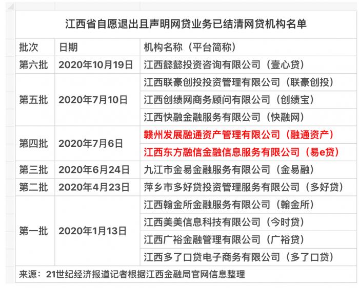 近日,江西省地方金融监督管理局(简称“江西金融局”)公告称,已批准江西东方融信科技信息服务有限公司(原江西东方融信金融信息服务有限公司,平台简称为“易e贷”)依法依规转型为全国经营的小额贷款公司。