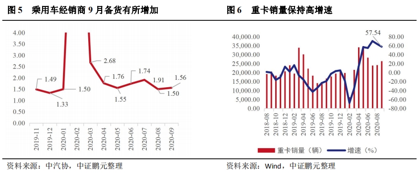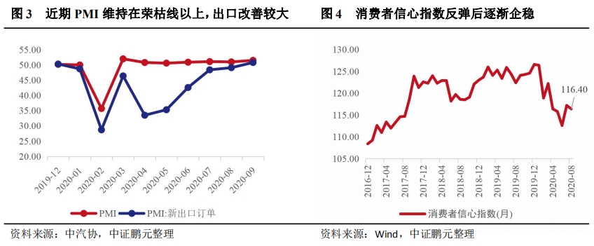中证鹏元预计汽车消费在第四季仍将维持较高景气度,是基于以下三点需求构成。首先,宏观经济反弹,消费者信心得到修复;其次,经销商补库存需求仍有较强动力;最后,物流、基建以及置换支撑了商用车需求。