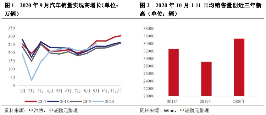 2020年9月迄今,车市“金九银十”如期而至,在工程车辆、SUV以及新能源汽车销售回暖的共同带动下,9月期间实现销售256.5万辆,同比增长12.8%,自2017年以来首次在9月份实现正增长;10月份1-11日,主要厂商的日均销售数量达35,335辆,同比增长21%,创近三年新高,今年的“金九银十”景气度得到明显修复。