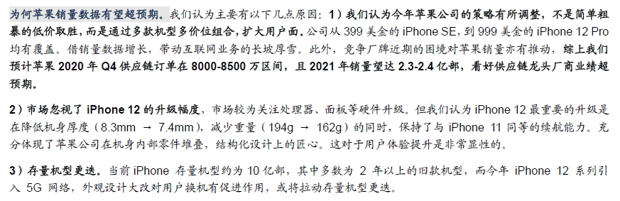 综合上述因素,信达证券预计,苹果今年第四季度供应链订单在8000万至8500万部,2021年销量有望达2.3亿-2.4亿部。