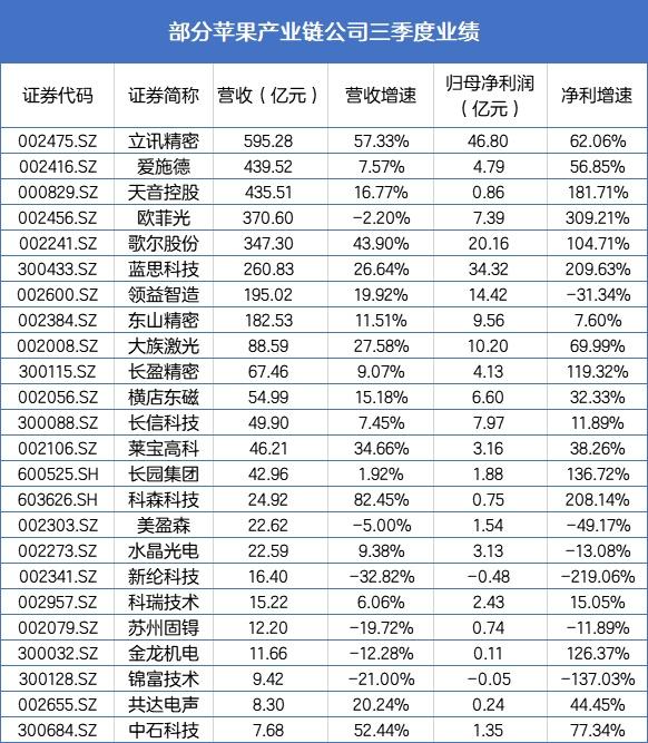 截至目前,部分苹果产业链公司三季度业绩如下: