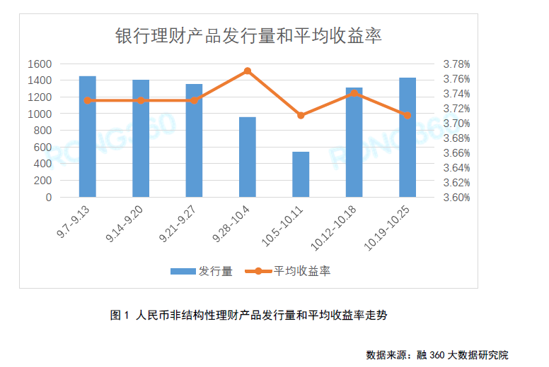 融360大数据研究院监测数据显示,上周(10月19日-10月25日)银行非结构性理财产品发行量共1428只,较前一周增加117只,发行量保持正常水平。