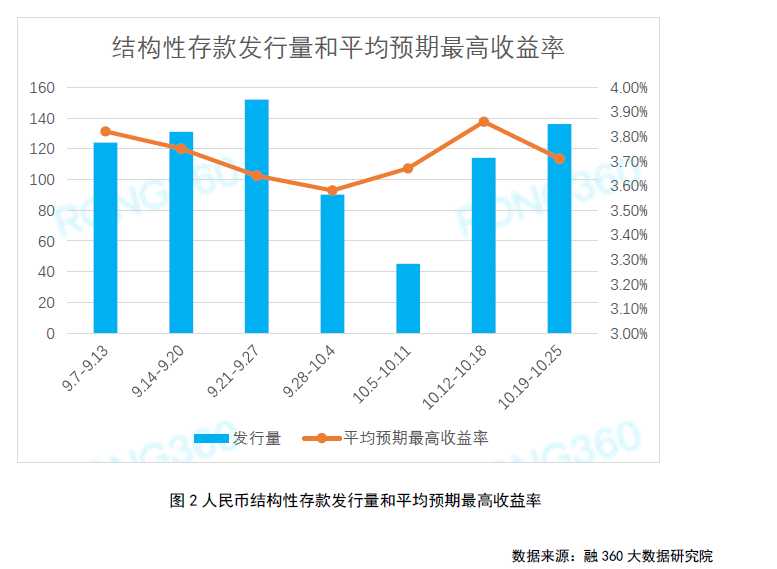 据融360大数据研究院不完全统计(主要监测国有银行、股份制银行),上周(10月19日-10月25日)人民币结构性存款发行量共136只,较前一周增加22只,结构性存款发行量已连续两周增长。平均期限为124天,较前一周缩短4天,平均预期最高收益率为3.71%,较前一周下降15BP。
