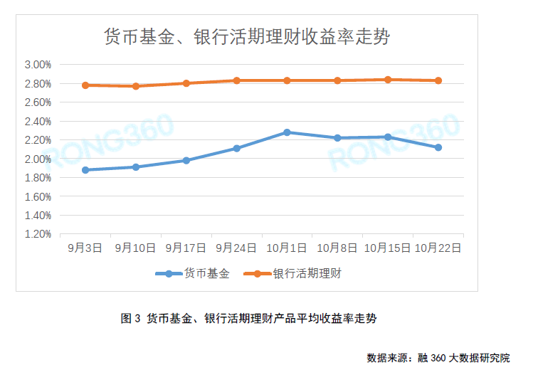 融360大数据研究院监测了货币基金、银行活期理财产品这两类活期理财产品的收益率,上周(10月16日-10月22日)货币基金平均七日年化收益率为2.12%,较前一周下降11BP,货币基金收益率已连续五周保持在2%以上的水平,受节假日流动性收紧的影响,最高曾达到2.28%,随着流动性的释放,预计货币基金收益率将继续回落。