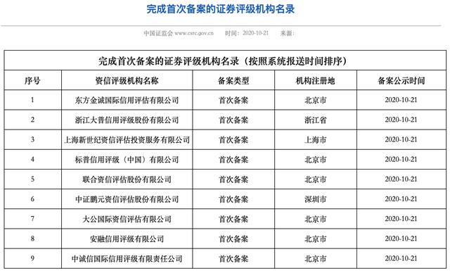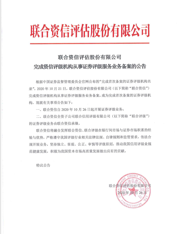 根据中国证券监督管理委员会官网公布的“完成首次备案的证券评级机构名录”,2020年10月21日,联合资信评估股份有限公司(以下简称“联合资信”)完成资信评级机构从事证券评级服务业务备案,成为完成首次备案的证券评级机构。
