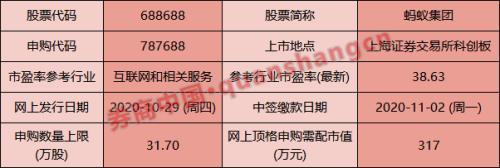 根据蚂蚁集团公布的信息,蚂蚁股网上发行6683万股,网上单一账户申购上限317000股,网上顶格申购需配置沪市市值317万元,其A股股票代码为688688,申购代码为787688。