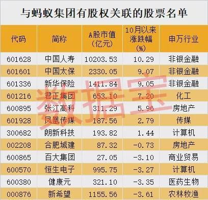 中国太保、中国人寿、新华保险则直接持有蚂蚁金服的股份。张江高科则通过持有上海金融发展投资基金二期(壹)间接持股蚂蚁金服;健康元通过持有上海经颐投资中心(有限合伙)持股蚂蚁金服;新希望通过拉萨草根合创资管有限公司间接参股蚂蚁金服。