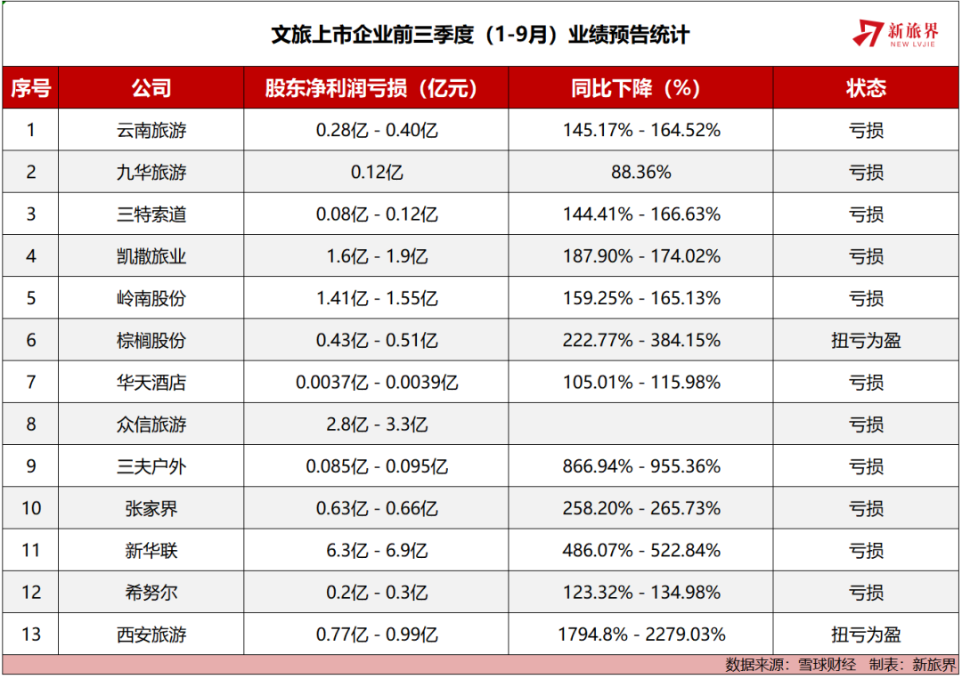 日前上市旅企陆续发布三季度业绩预告。从已公布业绩预告的旅企看,疫情对旅游行业的冲击仍在延续,虽有少数企业实现扭亏为盈,但主营业务的恢复依旧乏力。从市场层面看,第三季度随着跨省游与国庆黄金周的刺激,旅游市场恢复得以加速。然而,疫情影响下的旅游市场也发生了许多变化。比如说,游客消费习惯与选择的改变,令刚刚过生存危机的中小企业再迎经营难题。从数据层面看,在已公布第三季度业绩预告的13家旅企中,除棕榈股份(002431.SZ)和西安旅游(000610.SZ)外,剩余的12家企业均处于亏损状态。