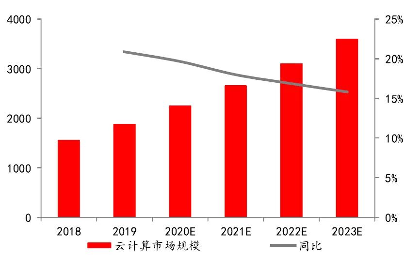 近年云计算业务边界不断拓宽,市场快速发展。随着云计算技术不断发展成熟,同时数字经济下云计算成为企业数字化转型的选择,云计算应用从互联网行业向政务、金融、工业、医疗等传统行业加速渗透。据Gartner数据,2019年全球云计算市场规模达到1883亿美元(计算涵盖IaaS、PaaS和SaaS市场),同比增速 20.86%。按未来4年行业市场平均增长率约18%计算,2023年行业总体市场规模将超过3500亿美元。