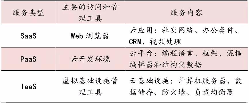 云计算类型可以分为三种服务模式,软件即时服务(SaaS)、平台即时服务(PaaS)、基础设施服务(IaaS),主要根据服务模式不同进行区分,服务不同导致客户需购买资产不同,当前欧美发展趋势皆是向轻资产模式迈进,从IaaS和PaaS即向SaaS服务发展。