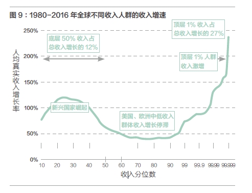 上述观点的一个证据是全球收入分配格局的变化。图9 是学术界热议的“全球不平等增长大象曲线”(Elephant Curve of Global Inequality and Growth) 。全球化带来了收入增长效应,而这种效应对于不同国家有所不同。在全球人口收入分布中,低收入人群主要分布在发展中国家,尤其是新兴市场经济国家,而他们在全球化过程中是收益者,享受到了更高速度的收入增长;而中等收入人群则主要是发达国家中的低收入人群,他们受到失业和工作不稳定的影响,其收入增长是相对缓慢的;高收入人群主要是发达国家中的高收入群体,全球中的巨富人群,他们则是全球化中的最大受益者,其收入增长速度高出全球平均水平几倍(Alvaredo 等人, 2017)。