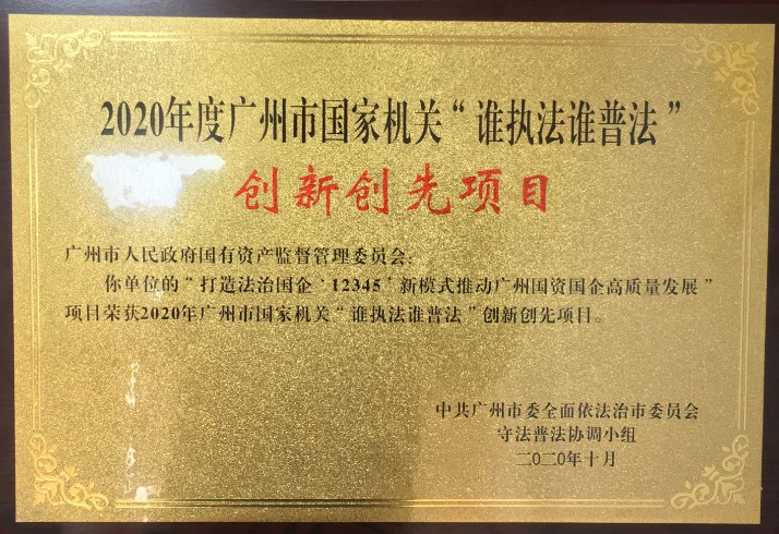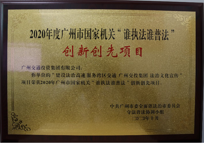 市国资委申报的“打造法治国企‘12345’新模式 推动广州国资国企高质量发展”项目和广州交投集团的“建设法治高速 服务湾区交通”项目,在全市72家参评单位中脱颖而出,获评2020年度广州市“谁执法谁普法”十大创新创先项目。广州交投集团积极参加“谁执法谁普法”履职考评,经过社会评议、评议团评委现场评分、参会人员现场投票打分,被评为“优秀”等次。