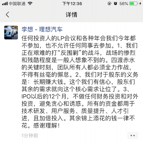 理想汽车李想:聚焦反围剿战斗,IPO后12个月内不做任何对外投资
