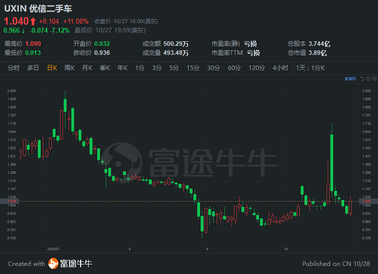 优信二手车昨日大涨超11%,报1.04美元,总市值3.89亿美元。