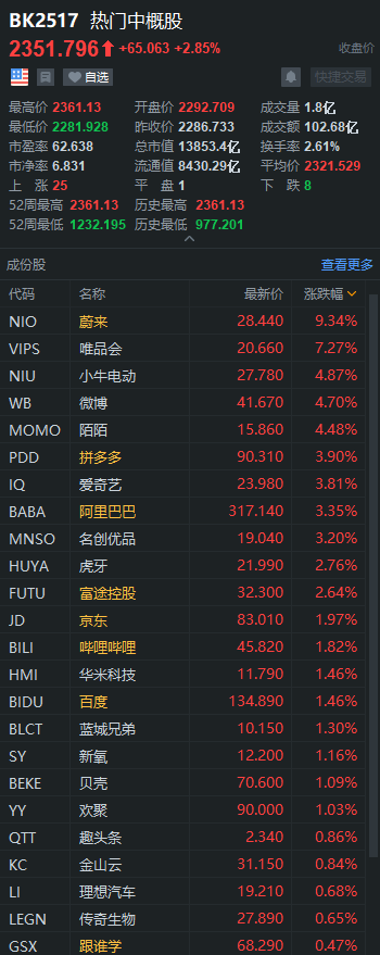 知名中概股中,阿里巴巴涨3.35%创历史新高;腾讯ADR大涨5.73%创新高;百度涨1.46%;京东涨1.97%;网易涨1.97%;新浪跌0.26%;新浪微博涨4.7%;拼多多涨3.9%;趣头条涨0.86%;蔚来涨9.34%;爱奇艺涨3.81%;陌陌涨4.48%;欢聚时代涨1.03%;虎牙涨2.76%;哔哩哔哩涨1.82%。