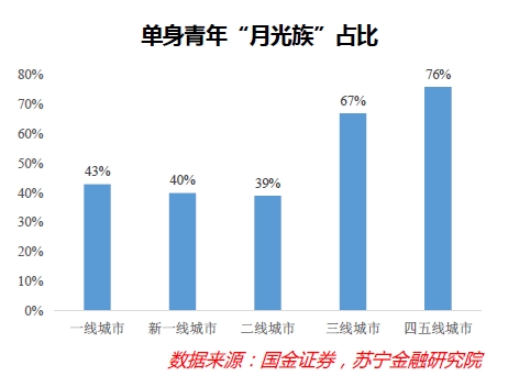 国金证券的数据显示,在一线、新一线和二线城市,大约40%左右的单身青年们都处于“月光”的生活状态;随着城市等级向下及月收入的降低,“月光”比例大幅提升,四五线城市的单身年轻人中,“月光族”所占比例高达76%。从收入水平看,大部分一线城市的单身青年月度可支配收入在8000~15000元,而从新一线城市往下,大部分单身青年的月度可支配收入仅为2000~5000元。