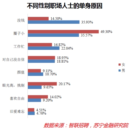 当然还有其他原因。有调查数据显示,无论是男性还是女性,圈子小都是阻碍自己成功脱单的主要原因,占比分别高达35.57%和49.3%;此外,男性的经济条件较差和女性的择偶要求较高也是导致单身人群规模日渐壮大的核心因素。