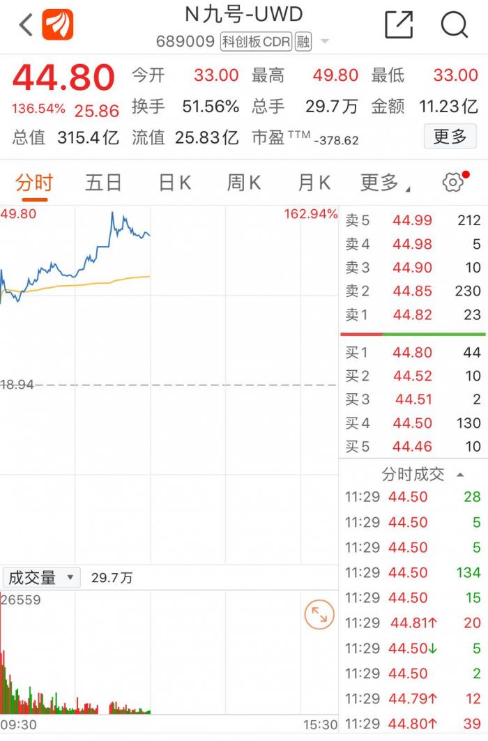 九号公司股价开盘即大涨,股价为33元/股,较发行价上涨74.23%,而后一路上行,截至午盘,股价报44.80元/股,涨幅逾136%,市值已超过315亿元。