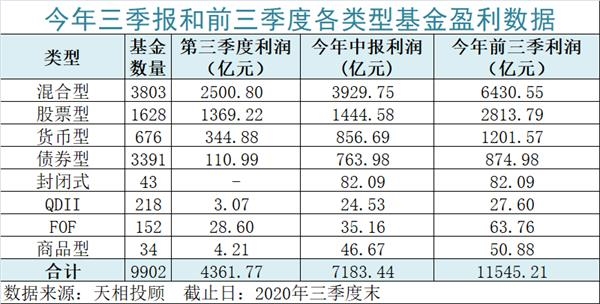 天相投顾数据显示,截至三季度末,各类型公募基金在第三季度盈利4360多亿元,叠加今年中报数据,今年前三季度公募基金大赚1.15万亿元,又成为公募基金赚钱的大年。