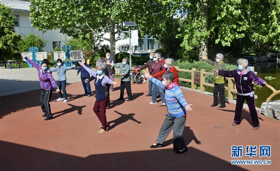北京海淀区四季青镇敬老院的老人们在学习跳舞(2020年5月10日摄)。新华社记者 李欣 摄