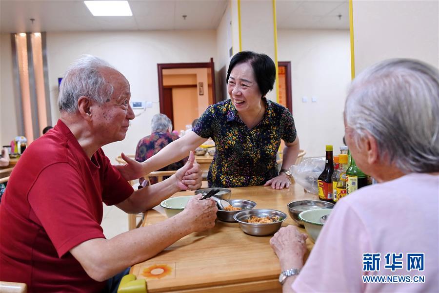 福州市鼓楼区东街街道军门社区老人刘建国(左)在社区居家养老服务照料中心就餐(2019年7月30日摄)。新华社记者 林善传 摄