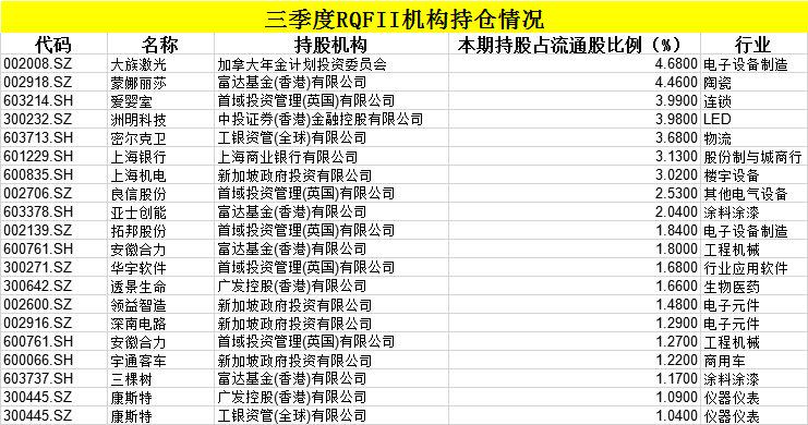 券商软件数据显示,三季度RQFII机构出现在31家上市公司股东名单中。持股比例占流通股比例在3%以上的上市公司有7家,分别是大族激光(002008)、蒙娜丽莎(002918)、爱婴室(603214)、洲明科技(300232)、密尔克卫(603713)、上海银行(601229)、上海机电(600835)。