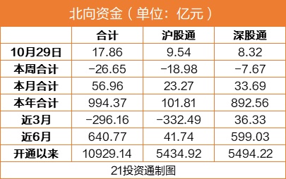 北向资金合计净流入17.86亿元,其中,沪股通净流入9.54亿元,深股通净流入8.32亿元。
