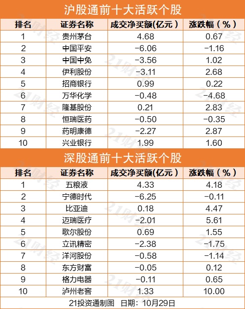 十大活跃个股方面,贵州茅台(600519.SH)、五粮液(000858.SZ)、兴业银行(601166.SH)、泸州老窖(000568.SZ)净买入居前,分别获净买入4.68亿元、4.33亿元、1.99亿元、1.33亿元。宁德时代(300750.SZ)、中国平安(601318.SH)均被净卖出逾6亿元。