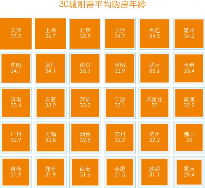 以购房年龄最大的天津为例,刚需购房平均约37.5岁,而天津整体平均购房年龄在35.4岁水平。与之相对的,重庆、成都、合肥、西安、郑州等新一线城市的刚需平均购房年龄相对较低,其中重庆刚需购房年龄最低,约为29.4岁。