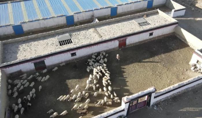 图为航拍西藏宗措村岗巴羊养殖合作社。
