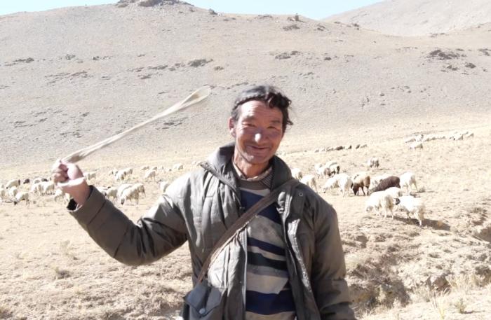 图为宗措村牧民用“乌尔朵”赶羊入圈。