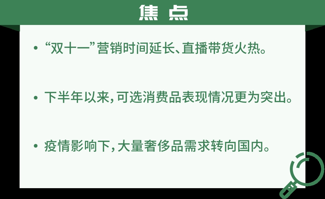 无论是促销时段加倍,还是直播带货有力拉动线上销售,今年双十一的变化都旨在拉长消费者线上停留时间。目前来看,本届“双十一”的品类仍以电子产品、家电、化妆品、服饰鞋帽等为主。化妆品作为去年“双十一”的明星品类,预计今年会通过推新品、做促销、送周边等立体化营销手段继续发力、值得期待。小食品和个人护理小家电作为直播间高频出现的“小而美”品类,预计今年有望获得较高增长。伴随年轻消费者的消费能力逐步增强,国货崛起或持续成为“双十一”的重要基调。