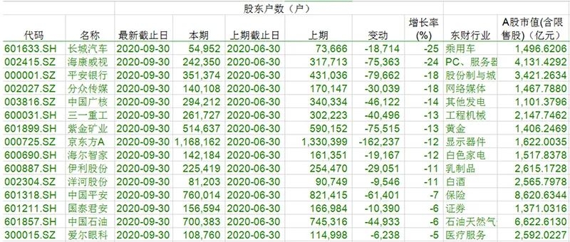 与筹码快速分散相对应,投资者更希望找到筹码相对集中的白马股,三季度筹码集中度居前的千亿白马股是长城汽车、海康威视和平安银行,但其股东户数降幅远没有上述增幅居前个股那么夸张。
